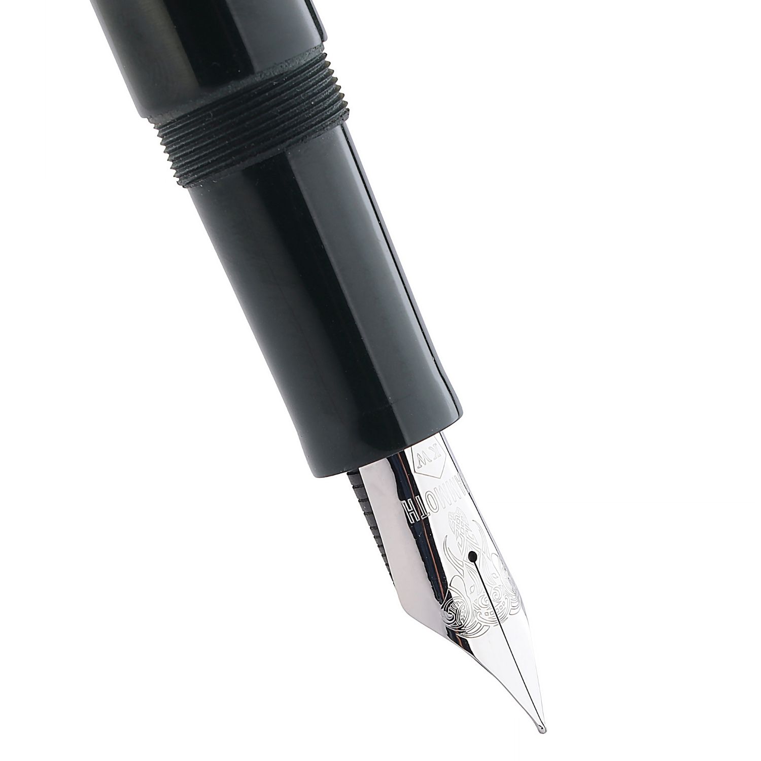 The oversized #9 nib offers a unique writing experience with impeccable writing feedback due to the 28mm long exposed nib surface offering better precision & control while writing characters. The 4 variations of tipping- EF, F, M, B complemented with a Super Flow Ebonite feeder offers smoothness coupled with wetness.